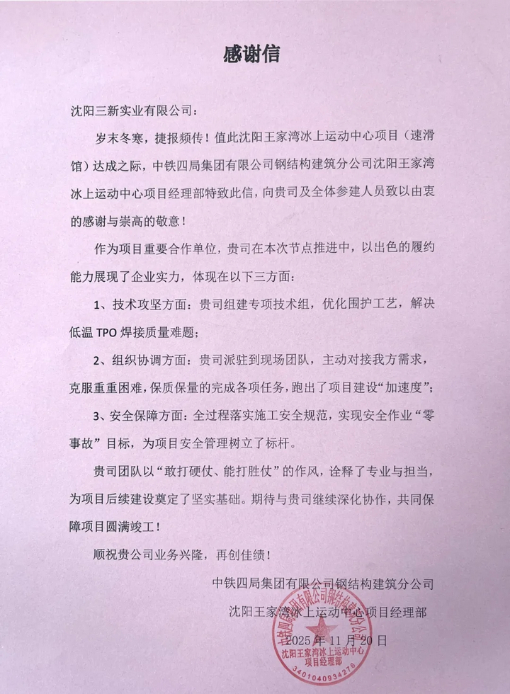 日前,中鐵四局項(xiàng)目部的感謝信跨越金秋而來,字里行間滿是對(duì)三新的敬意:“技術(shù)攻堅(jiān)破局、組織協(xié)調(diào)高效、安全保障扎實(shí),以‘三新力量’為場(chǎng)館如期封閉筑牢根基?!?/span>這紙贊譽(yù)背后,是汗水與堅(jiān)守的沉淀,更是對(duì)東北建筑鐵軍匠心與實(shí)力的最佳詮釋。